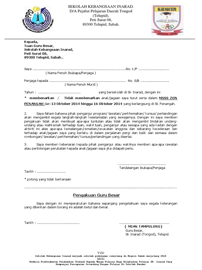 Dalam menjalankan aktiviti kokurikulum sama ada di luar atau di dalam sekolah amat penting untuk murid mendapat kebenaran daripada ibu bapa untuk menyertai aktiviti. CONTOH SURAT KEBENARAN BAWA MURID UNTUK AKTIVITI LUAR SEKOLAH ATAU LUAR WAKTU P N P. Kertas kerja mohon naiktaraf surau.
