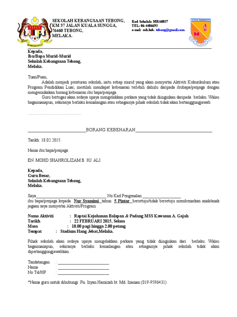 Contoh Surat Kebenaran Menyertai Aktiviti Kokurikulum. Surat kebenaran bawa murid aktiviti luar. Kemenjadian murid dan pelajar sangat penting di peringkat sekolah sama ada dalam.